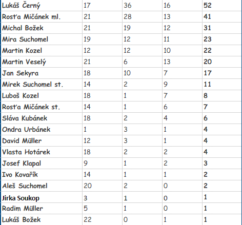 | Lukáš Černý | 22 | 18 | 34 | 52 |