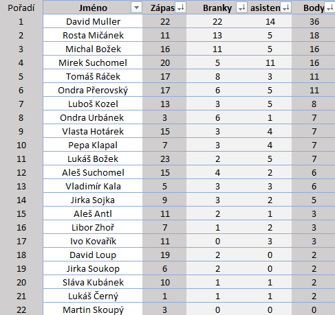 | Rosťa Mičánek st. | 22 | 7 | 12 | 19 |
